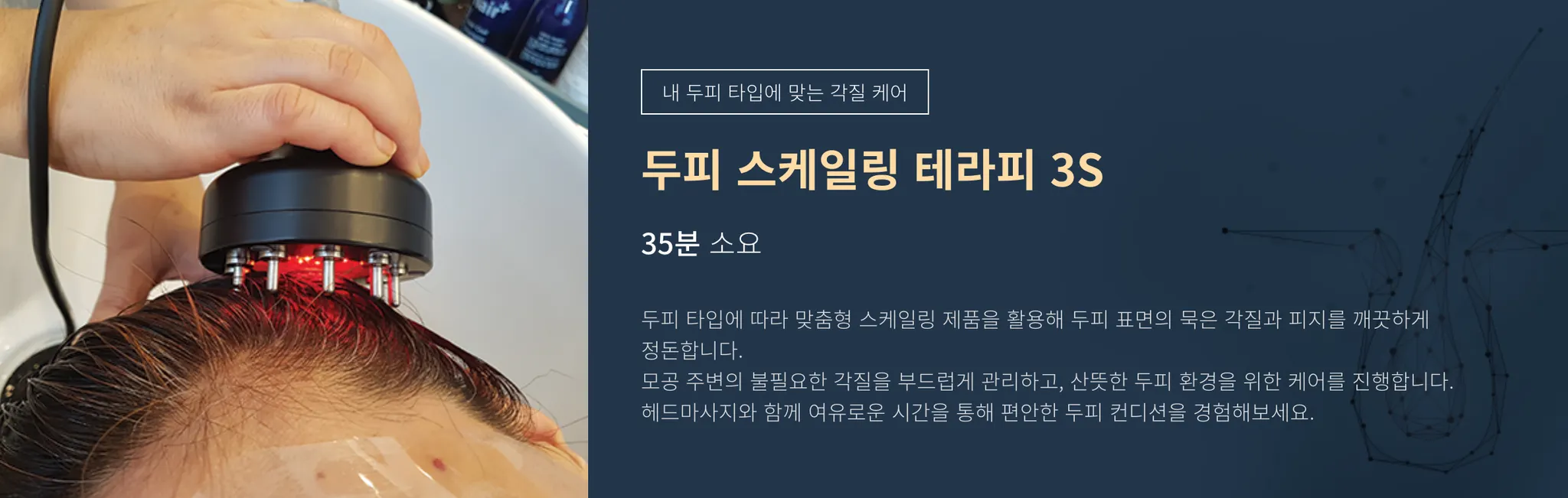 두피 테라피 (Scalp Therapy) | 전문가가 두피 상태를 정밀하게 진단하고, 그에 맞는 전문 기기와 제품을 사용하여 스케일링, 영양 공급, 순환 관리 등을 체계적으로 진행하는 전문 두피 관리 프로그램. |