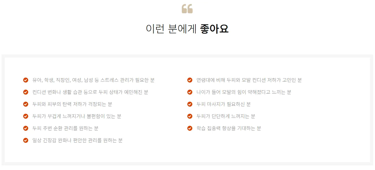 또한, 학업에 대한 압박감으로 끊임없이 두뇌를 사용해야 하는 학생들 역시 마찬가지입니다. 과도한 생각과 긴장 상태는 뇌의 과부하로 이어지고, 이는 집중력 저하와 만성 피로의 원인이 됩니다. 이 외에도 특별한 이유 없이 두피가 가렵거나 예민한 분, 모발이 힘없이 가늘어지는 것을 느끼는 분, 잦은 두통이나 불면증으로 고생하는 분들에게 이 프로그램은 훌륭한 해결책이 될 수 있습니다. 이는 단순히 두피 표면의 문제를 해결하는 것을 넘어, 문제의 근본적인 원인이 될 수 있는 '스트레스와 순환 저하'라는 뿌리를 건드려주기 때문입니다.