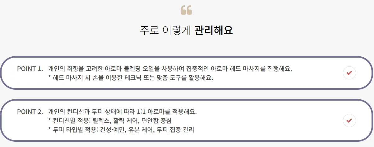 관리 시간 동안 은은하게 퍼지는 아로마 향은 후각 신경을 통해 뇌에 직접적인 안정 신호를 보내고, 스트레스 호르몬인 코르티솔 수치를 낮추는 데 도움을 줍니다. 이렇게 물리적인 이완(근막 테크닉)과 화학적, 감성적 이완(아로마테라피)이 결합될 때, 우리는 비로소 깊은 휴식의 상태에 도달할 수 있습니다. 이 과정은 단순히 두피의 건강을 회복시키는 것을 넘어, 복잡한 생각과 걱정으로 가득 찬 우리의 뇌에 잠시나마 쉼표를 찍어주는 의미 있는 시간이 됩니다. 건강한 두피 장벽을 유지하고, 외부 자극으로부터 스스로를 보호할 힘을 기르는 것은 결국 우리의 정신 건강을 지키는 중요한 첫걸음이 될 수 있습니다.