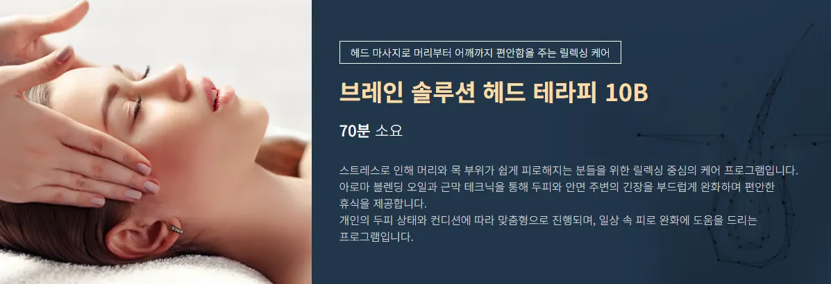 우리는 흔히 탈모나 비듬 같은 문제가 생겨야 비로소 두피에 관심을 갖기 시작합니다. 하지만 두피는 단순히 머리카락이 자라는 땅 이상의 의미를 지닙니다. 수많은 신경과 혈관이 밀집해 있어 우리 뇌의 컨디션과 아주 밀접하게 연결되어 있는, 이를테면 '뇌의 정원'과도 같은 곳이죠. 만약 이 정원의 토양이 스트레스와 피로로 인해 딱딱하게 굳어 있다면, 그 안의 식물인 모발은 물론이고 정원 전체의 생기, 즉 우리의 정신적 컨디션까지 나빠질 수밖에 없습니다. 오늘 이야기할 '브레인 솔루션 헤드 테라피 10B 프로그램'은 바로 이 지점에서 출발합니다. 머리카락만을 위한 관리가 아닌, 두피를 통해 뇌에 직접적인 휴식을 전달하고 스트레스를 완화하는 새로운 차원의 접근법이라 할 수 있습니다. 이는 마치 뭉친 어깨 근육을 마사지로 풀어주듯, 생각과 스트레스로 꽉 막힌 머릿속을 두피에서부터 부드럽게 이완시켜주는 것과 같습니다. 이 프로그램이 어떻게 우리의 지친 뇌를 달래고 새로운 활력을 불어넣는지, 연구자의 시선으로 차근차근 함께 살펴보겠습니다.
