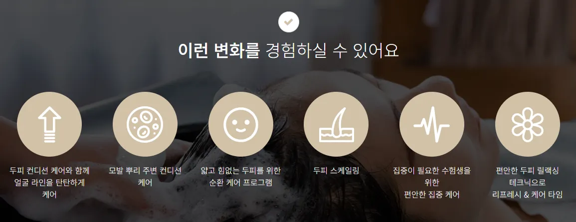 두피 스케일링 (Scalp Scaling) | 샴푸만으로는 제거하기 어려운 두피의 묵은 각질, 피지, 노폐물 등을 전문적인 제품과 기기를 사용하여 제거하는 관리입니다. 모공을 깨끗하게 하여 두피의 호흡을 돕고 건강한 모발이 자랄 수 있는 환경을 만듭니다. |