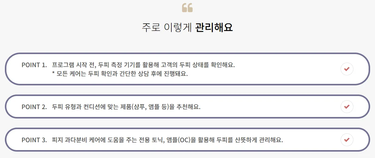 많은 분들이 두피 관리를 떠올리면 가장 먼저 미용실의 클리닉 서비스를 생각합니다. 하지만 미용실의 두피 관리와 헤드스파K가 제공하는 관리는 그 목표와 접근 방식에서 근본적인 차이를 보입니다. 일반 미용실의 두피 클리닉이 일시적인 시원함이나 모발의 부드러움에 초점을 맞추는 경우가 많다면, 헤드스파K는 두피 문제의 ‘근본 원인 해결’을 목표로 합니다. 이러한 차이는 실제 관리를 경험한 고객들의 후기에서도 명확히 드러납니다. 한 고객은 "미용실에서 받았을때랑 차원이 틀리고 시원하니 좋아요" 라고 평가했으며, 또 다른 고객은 "확실히 전문적으로 하는곳이라 그런지 달랐어요" 라고 언급하며 그 전문성의 차이를 이야기했습니다.